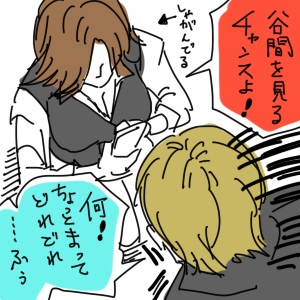 そんなレオンのために、メニュー操作中にしゃがみ込んだ時に谷間が見えるよとサービスしてあげました。